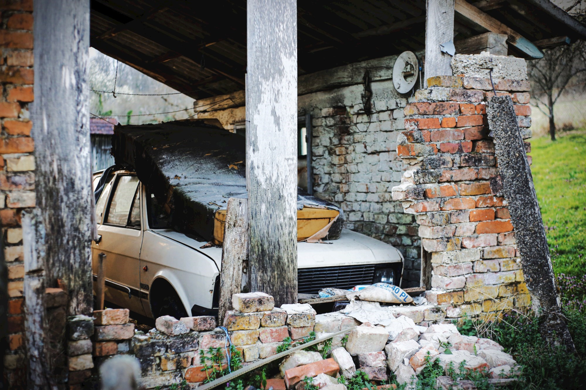 Gledamo kuću uništena krova. Cigle su popadale pa se jasno u potkrovlju vide ormari, kutije i registratori. Čini se kao da je tu bilo spremište kakve tvrtke. U prizemlju je parkiran Yugo. Na njega je palo nešto nalik na madrac.
