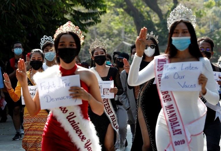 Reuters prenosi da se u centru Ranguna, metropole od pet milijuna stanovnika, okupilo nekoliko desetina tisuća ljudi. Oni su podizali tri prsta u znak protesta – ta gesta je preuzeta iz popularne kulture, odnosno iz sage Hunger Games gdje je koriste pobunjenici. Prosvjednici su skandirali: "Nećemo diktaturu! Hoćemo demokraciju!"