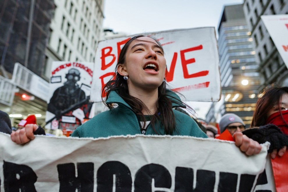 Prosvjednici su nosili transparente protiv ICE-a i tražili "pravdu" za Renee Good, još jednu stanovnicu Minneapolisa koju je ranije ovog mjeseca ubio agent ICE-a.