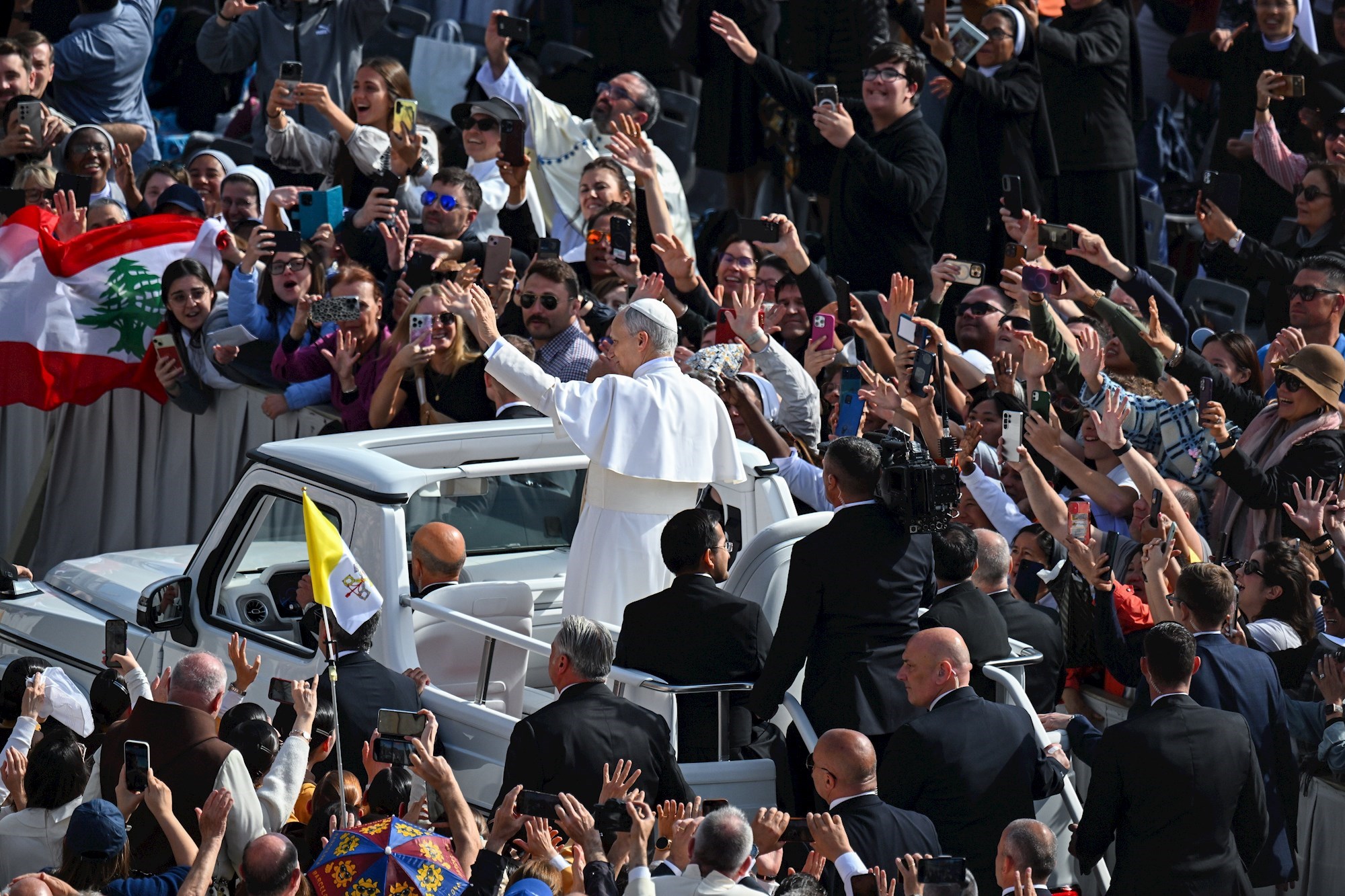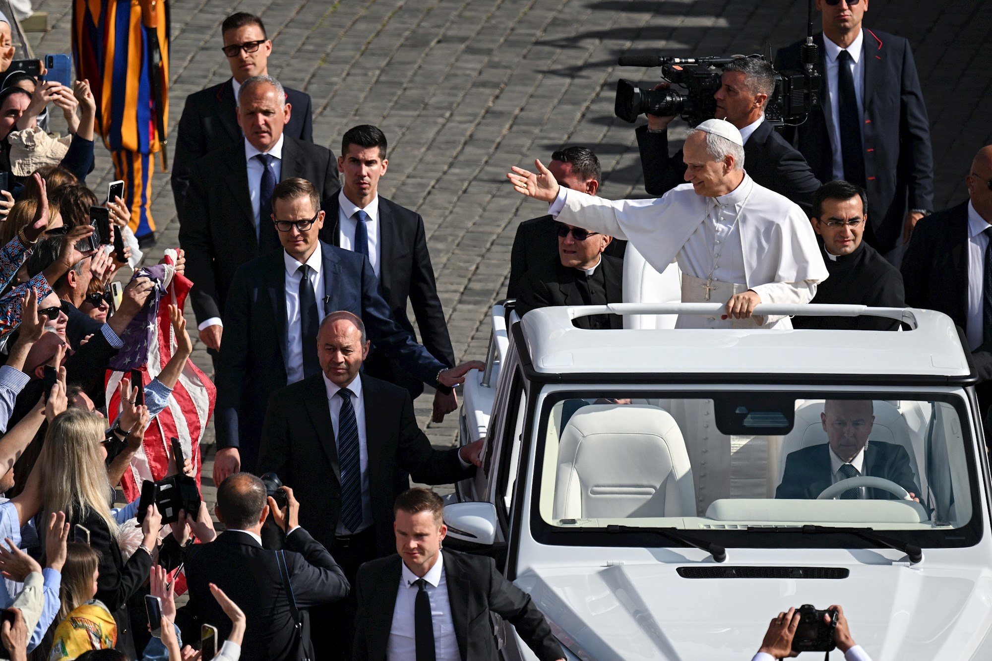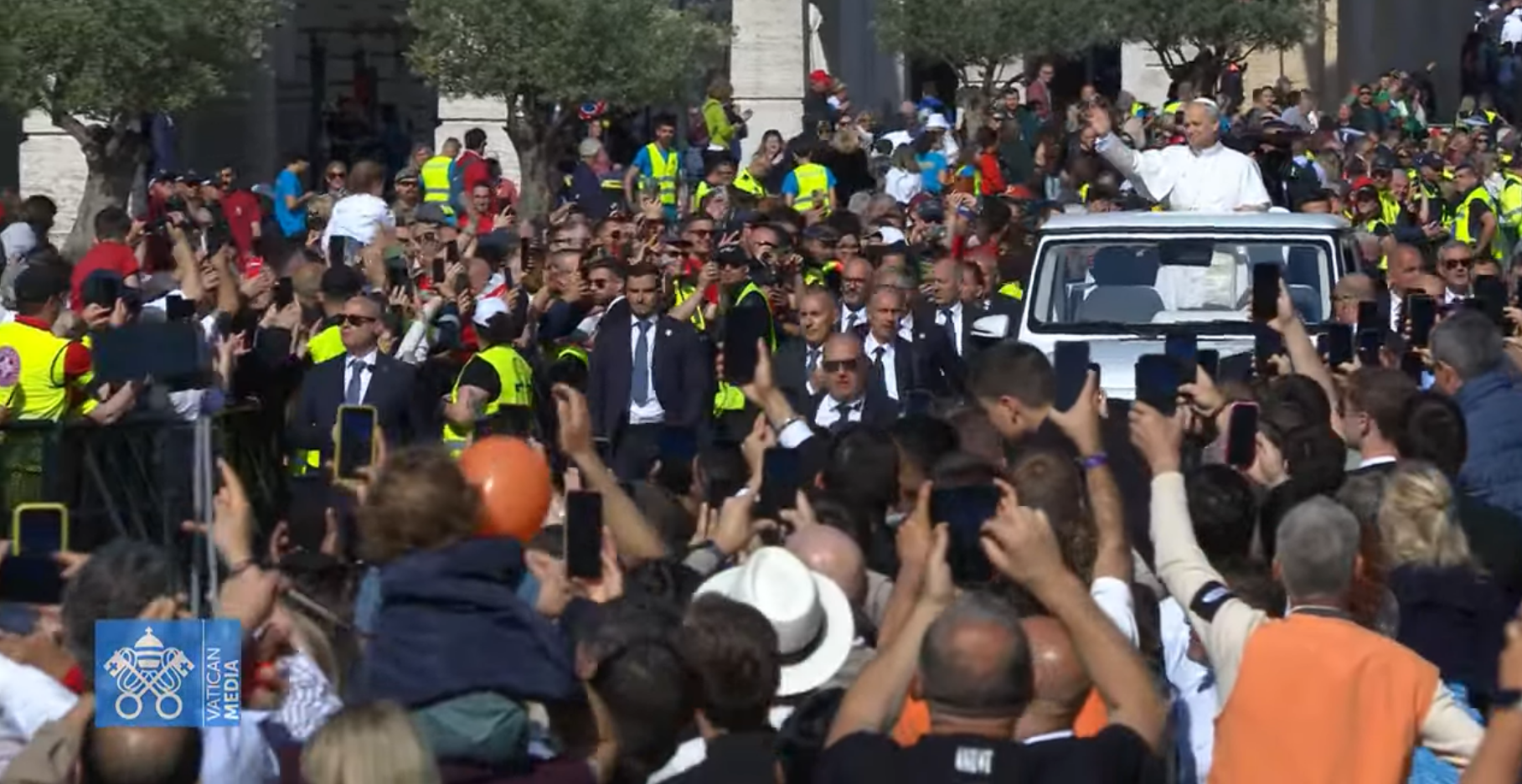 Papa Lav stigao je na Trg svetog Petra u papamobilu s otvorenim krovom, gdje pozdravlja mnoštvo okupljenih vjernika.