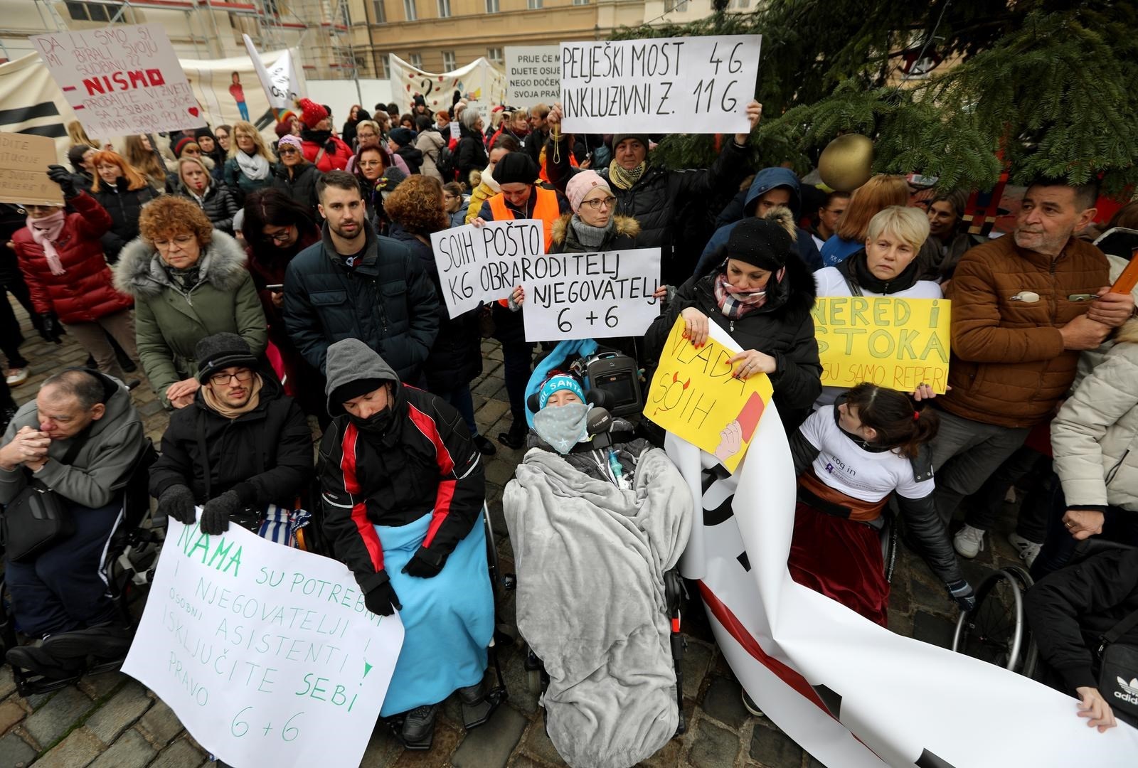 Stotinjak prosvjednika s transparentima poput "Sude nam jer volimo svoju djecu", "Uključivanje, ne ignoriranje", "Prije će mi dijete osijediti nego dočekati svoja prava", "Osobni asistent je pravo svake osobe s invaliditetom" i "Sutra to možeš biti ti", od resornog ministarstva i Vlade traže poboljšanje skrbi i veća prava..