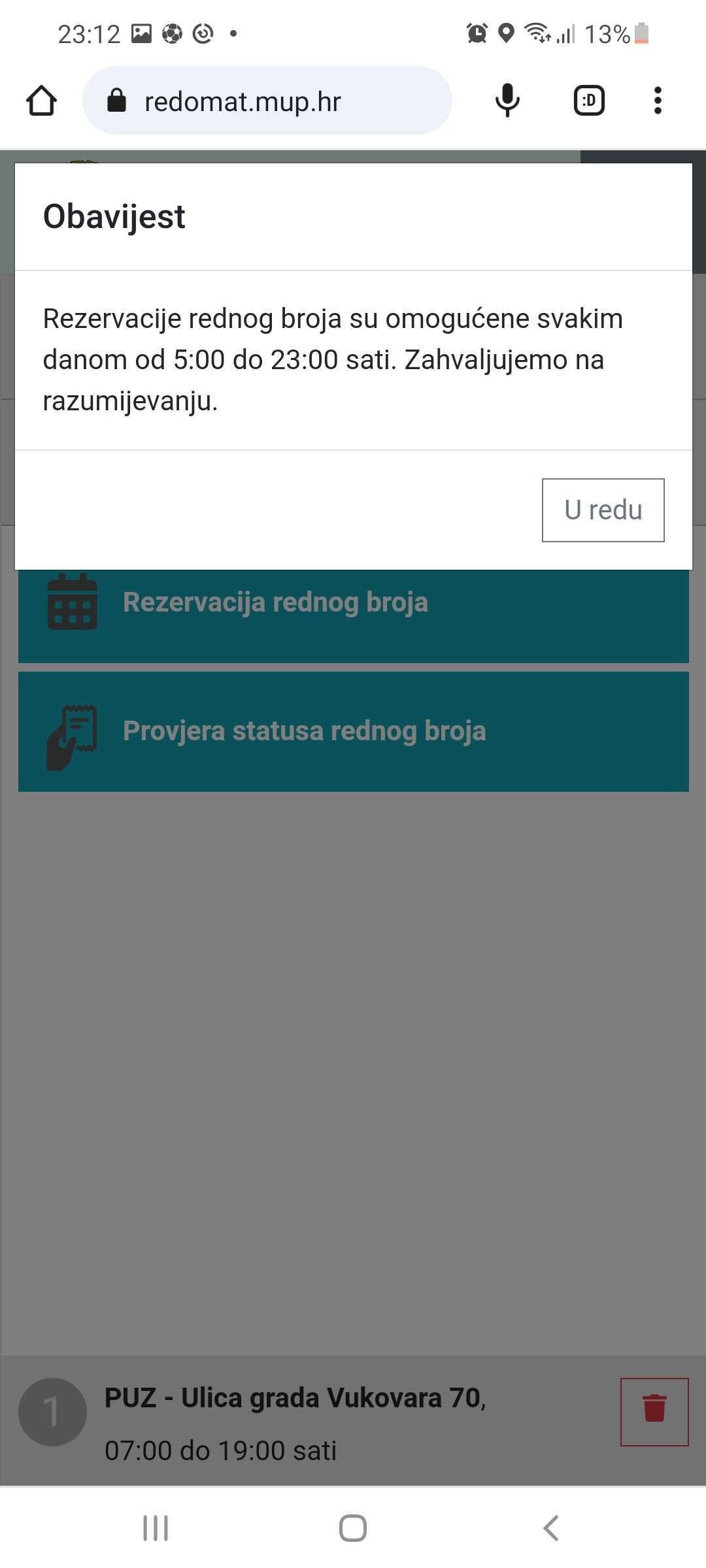 - Kliknete “Nisam robot” pa "U redu”, zatim dobijete obavijest u kojoj stoji koji je vaš redni broj i koji je broj posljednji prozvan